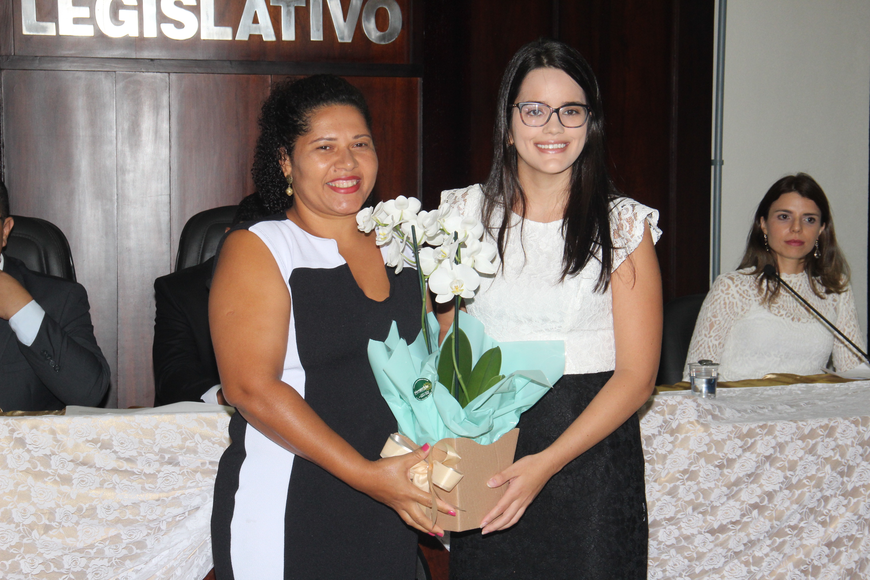 Vereadora Cleidislene Conceiçâo entregando flores a filha do homenageado